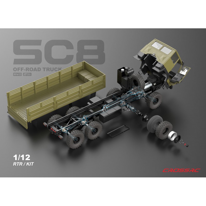 Modèle SC8 1/12, camion lourd professionnel à châssis entièrement métallique 8×8 – Véhicule tout-terrain avec simulation de direction à double essieu avant