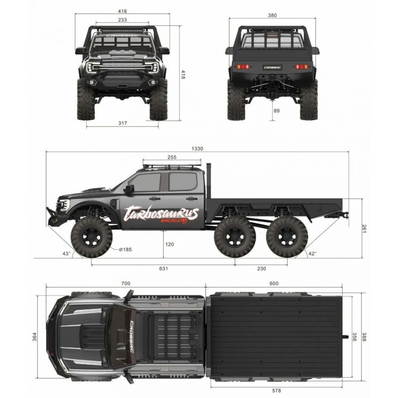 Longueur totale de 1,32 mètre (carrosserie 0,88 mètre + châssis 0,44 mètre), après avoir suspendu l’ensemble de la voiture à 2,4 mètres, l’élan est tel celui d’un dragon, écrasant tout le terrain ;