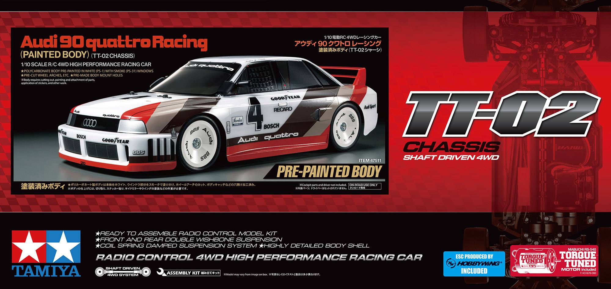• Châssis TT-02 4×4 à cardans fiable et performant avec de nombreuses possibilités d’options.